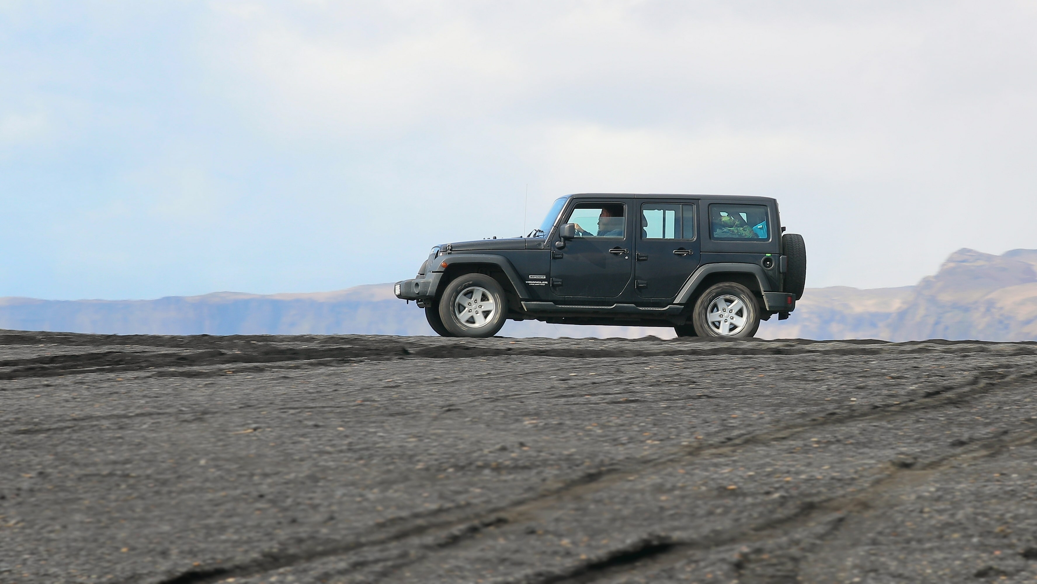 VIK, ICELAND - MAY 03, 2018. Jeep Wrangler Unlimited Sport four wheel drive vehicle being used on terrain on a black sand beach in Iceland